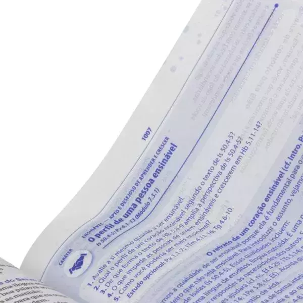 A SBB lança a Bíblia de Estudo do Discipulado, agora em versão completa. A publicação é totalmente voltada àqueles que querem vivenciar os ensinamentos sagrados, como discípulos de Jesus Cristo, crescendo no amor e no discipulado. Para isso, traz sete cursos: Discipulado, Relacionamentos, Casamento, Equipes, Restauração, Personagens bíblicos e Caráter. Cada curso tem oito módulos e,cada módulo, oito estudos, além de onze estudos avulsos. A obra reúne, ainda, notas e estudos voltados especialmente para pequenosgrupos e introdução ao discipulado de Jesus. As anotações, reflexões e estudos têm a finalidade de fazer com que o discípulo cresça, a cada dia, em seu propósito e possa discipular outras pessoas.