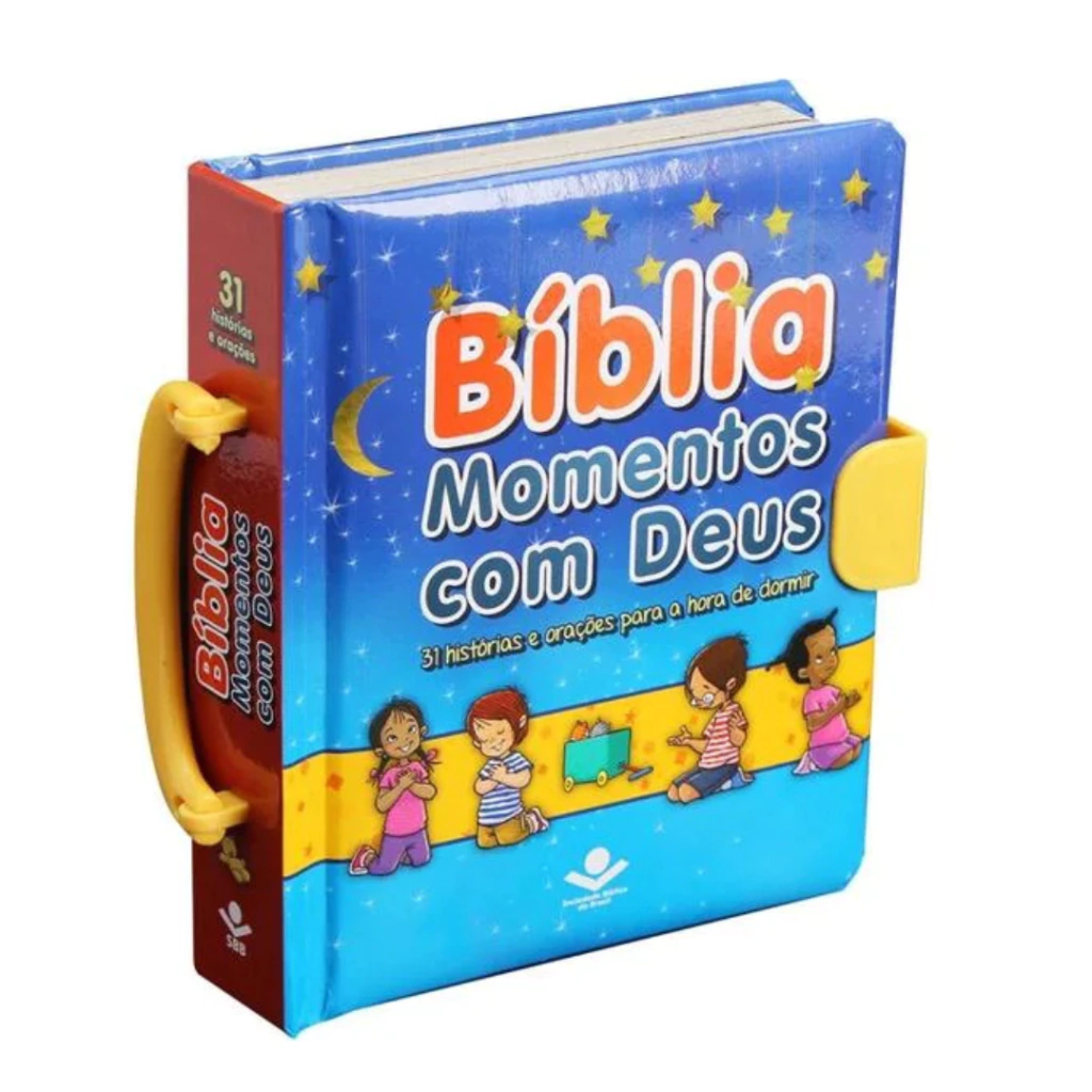 A Bíblia Momentos com Deus é uma edição devocional infantil elaborada para incentivar o hábito de ler a Bíblia e orar desde cedo. Ela apresenta uma seleção de 31 histórias bíblicas — 14 do Antigo Testamento e 17 do Novo Testamento — em formato portátil com capa dura almofadada, alça de plástico e fecho que facilita o uso pelas próprias crianças em qualquer lugar