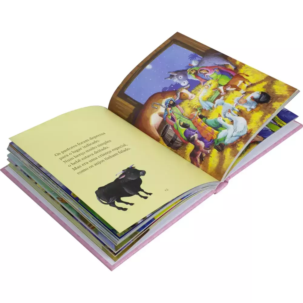 12 do Novo Testamento, incluindo: nascimento de Jesus, multiplicação dos pães e peixes, crucificação e ressurreição de Jesus As narrativas são recontadas em forma de rima, o que facilita a memorização e torna a leitura divertida para as crianças .